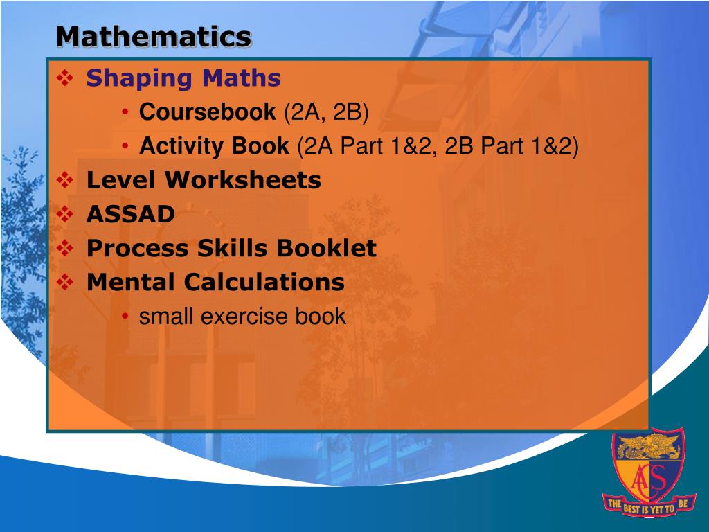Mathematics Shaping Maths Coursebook (2A, 2B) Activity Book (2A Part 1&2, 2B Part 1&2) Level Worksheets ASSAD Process Skills Booklet Mental Calculations small exercise book