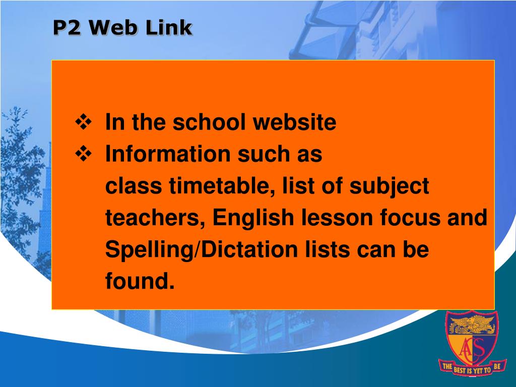 In the school website • Information such as • class timetable, list of subject • teachers, English lesson focus and • Spelling/Dictation lists can be • found. P2 Web Link