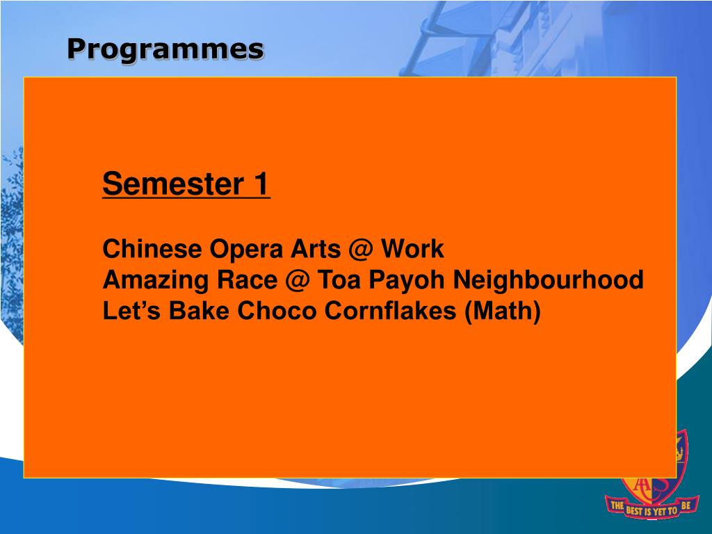 Semester 1 • Chinese Opera Arts @ Work • Amazing Race @ Toa Payoh Neighbourhood • Let’s Bake Choco Cornflakes (Math) Programmes
