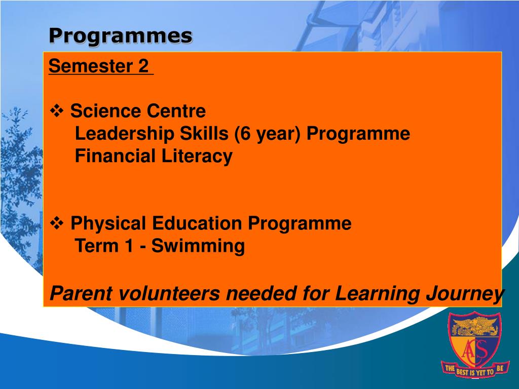 Semester 2 • Science Centre • Leadership Skills (6 year) Programme • Financial Literacy • Physical Education Programme • Term 1 - Swimming • Parent volunteers needed for Learning Journey Programmes