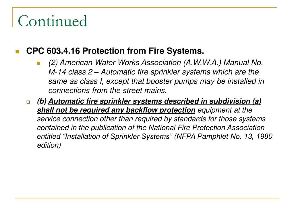 Continued • CPC 603.4.16 Protection from Fire Systems. • (2) American Water Works Association (A.W.W.A.) Manual No. M-14 class 2 – Automatic fire sprinkler systems which are the same as class I, except that booster pumps may be installed in connections from the street mains. • (b) Automatic fire sprinkler systems described in subdivision (a) shall not be required any backflow protection equipment at the service connection other than required by standards for those systems contained in the publication of the National Fire Protection Association entitled “Installation of Sprinkler Systems” (NFPA Pamphlet No. 13, 1980 edition)