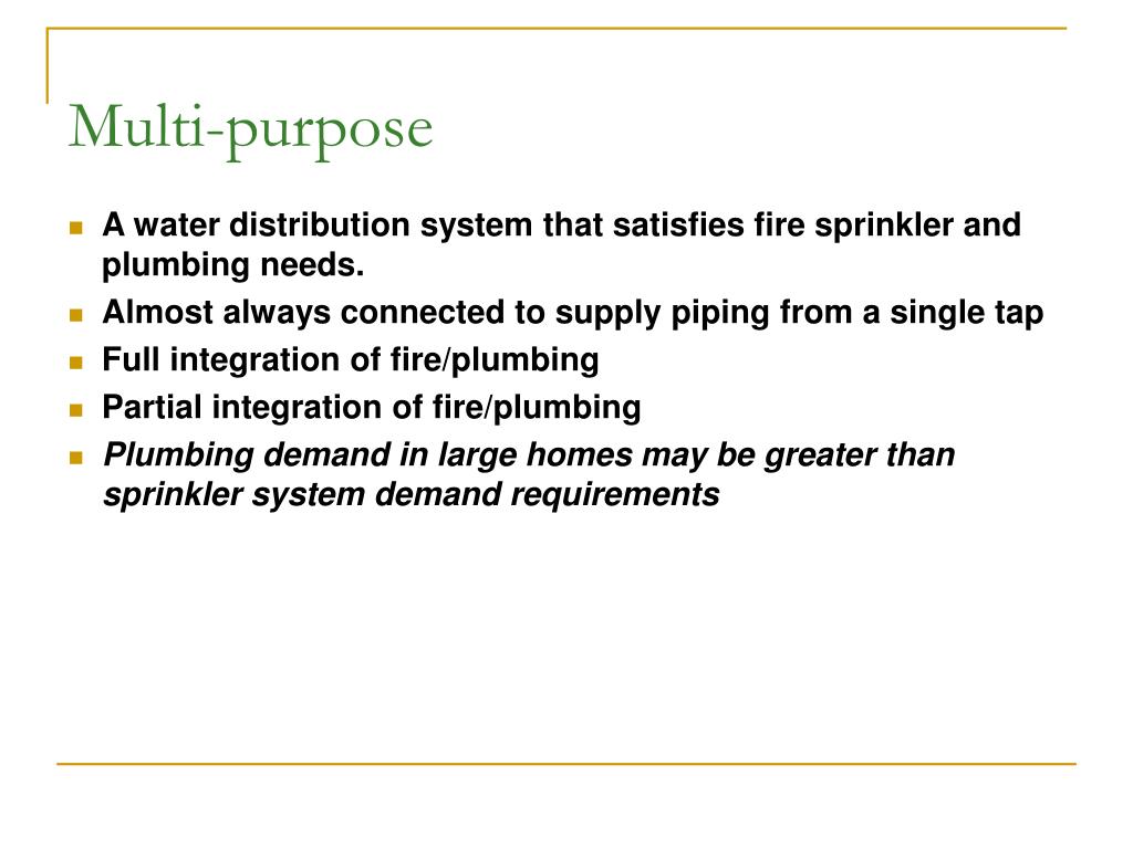Multi-purpose A water distribution system that satisfies fire sprinkler and plumbing needs. Almost always connected to supply piping from a single tap Full integration of fire/plumbing Partial integration of fire/plumbing Plumbing demand in large homes may be greater than sprinkler system demand requirements