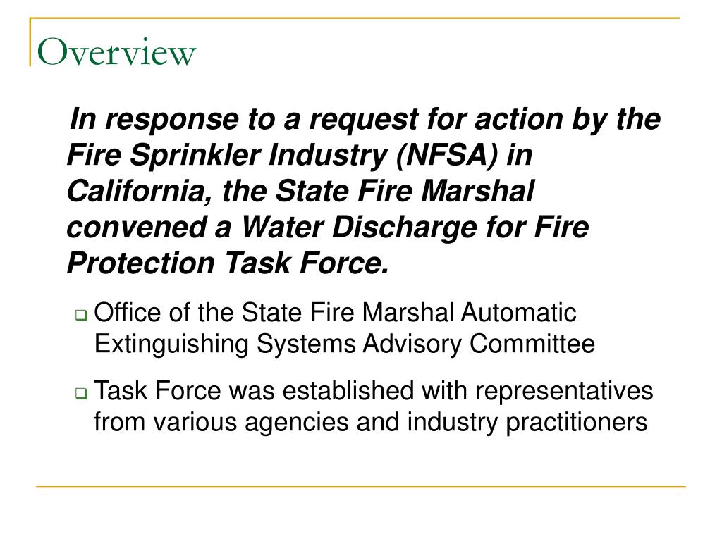 Overview In response to a request for action by the Fire Sprinkler Industry (NFSA) in California, the State Fire Marshal convened a Water Discharge for Fire Protection Task Force. • Office of the State Fire Marshal Automatic Extinguishing Systems Advisory Committee • Task Force was established with representatives from various agencies and industry practitioners