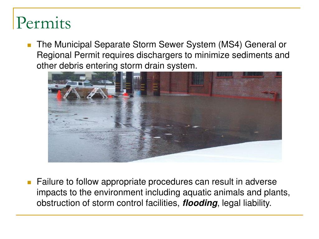 Permits The Municipal Separate Storm Sewer System (MS4) General or Regional Permit requires dischargers to minimize sediments and other debris entering storm drain system. Failure to follow appropriate procedures can result in adverse impacts to the environment including aquatic animals and plants, obstruction of storm control facilities, flooding, legal liability.