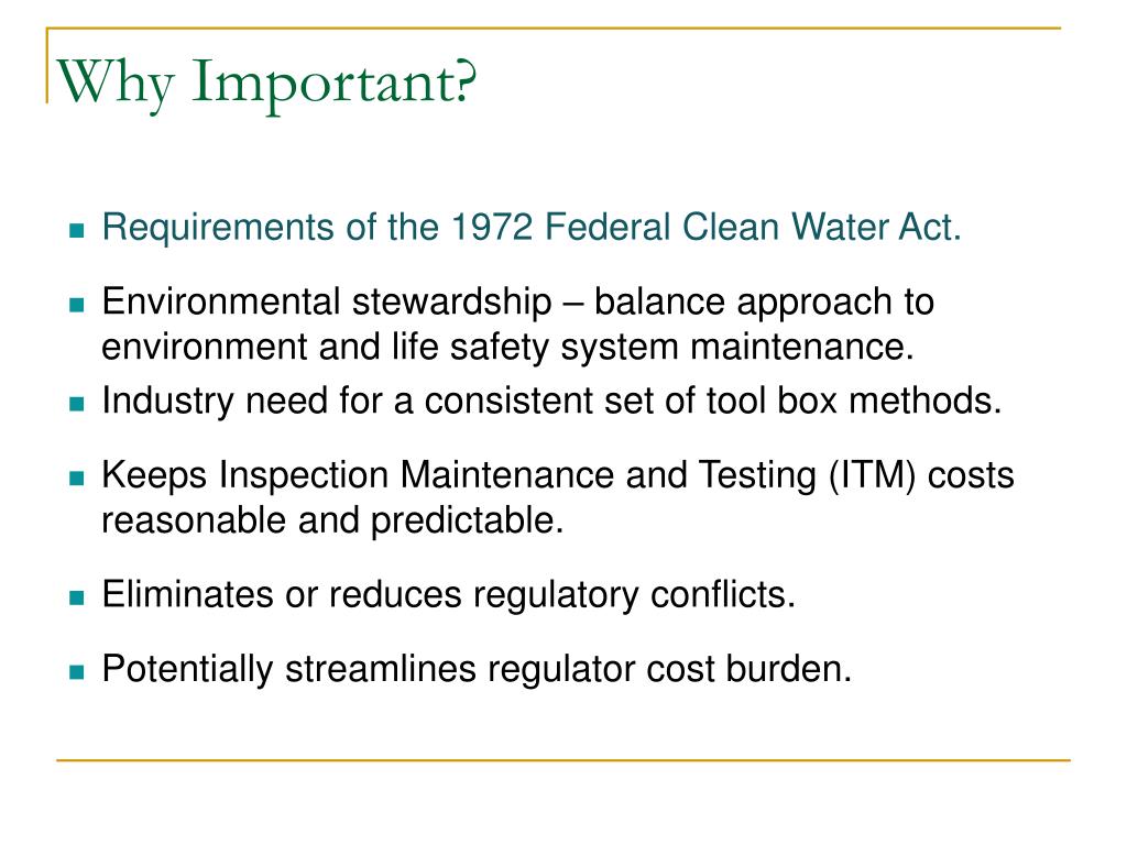 Why Important? Requirements of the 1972 Federal Clean Water Act. Environmental stewardship – balance approach to environment and life safety system maintenance. Industry need for a consistent set of tool box methods. Keeps Inspection Maintenance and Testing (ITM) costs reasonable and predictable. Eliminates or reduces regulatory conflicts. Potentially streamlines regulator cost burden.