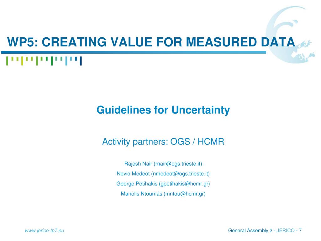 WP5: creating value for measured data • Guidelines for Uncertainty • Activity partners: OGS / HCMR • Rajesh Nair (rnair@ogs.trieste.it) • NevioMedeot (nmedeot@ogs.trieste.it) • George Petihakis (gpetihakis@hcmr.gr) • ManolisNtoumas (mntou@hcmr.gr) www.jerico-fp7.eu
