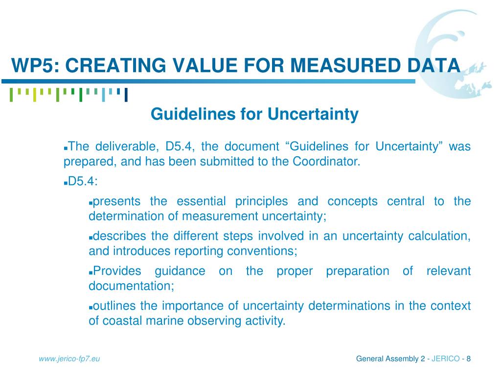 WP5: creating value for measured data • Guidelines for Uncertainty • The deliverable, D5.4, the document “Guidelines for Uncertainty” was prepared, and has been submitted to the Coordinator. • D5.4: • presents the essential principles and concepts central to the determination of measurement uncertainty; • describes the different steps involved in an uncertainty calculation, and introduces reporting conventions; • Provides guidance on the proper preparation of relevant documentation; • outlines the importance of uncertainty determinations in the context of coastal marine observing activity. www.jerico-fp7.eu