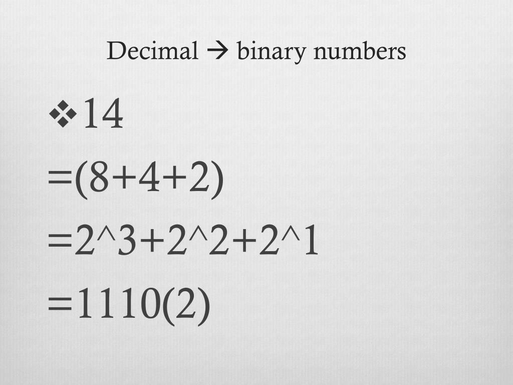 Decimal binary numbers • 14 =(8+4+2) =2^3+2^2+2^1 =1110(2)