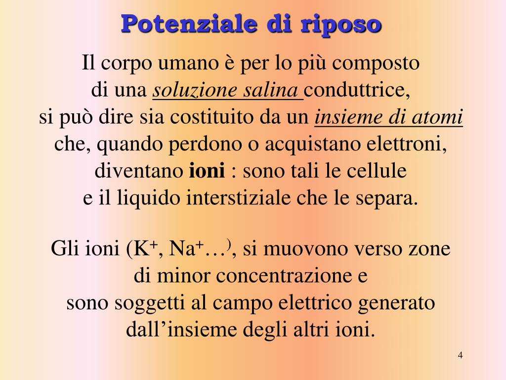 Potenziale di riposoIl corpo umano è per lo più composto di una soluzione salinaconduttrice, si può dire sia costituito da un insieme di atomiche, quando perdono o acquistano elettroni,diventano ioni : sono tali le cellule e il liquido interstiziale che le separa.Gli ioni (K+, Na+…), si muovono verso zone di minor concentrazione e sono soggetti al campo elettrico generato dall’insieme degli altri ioni.