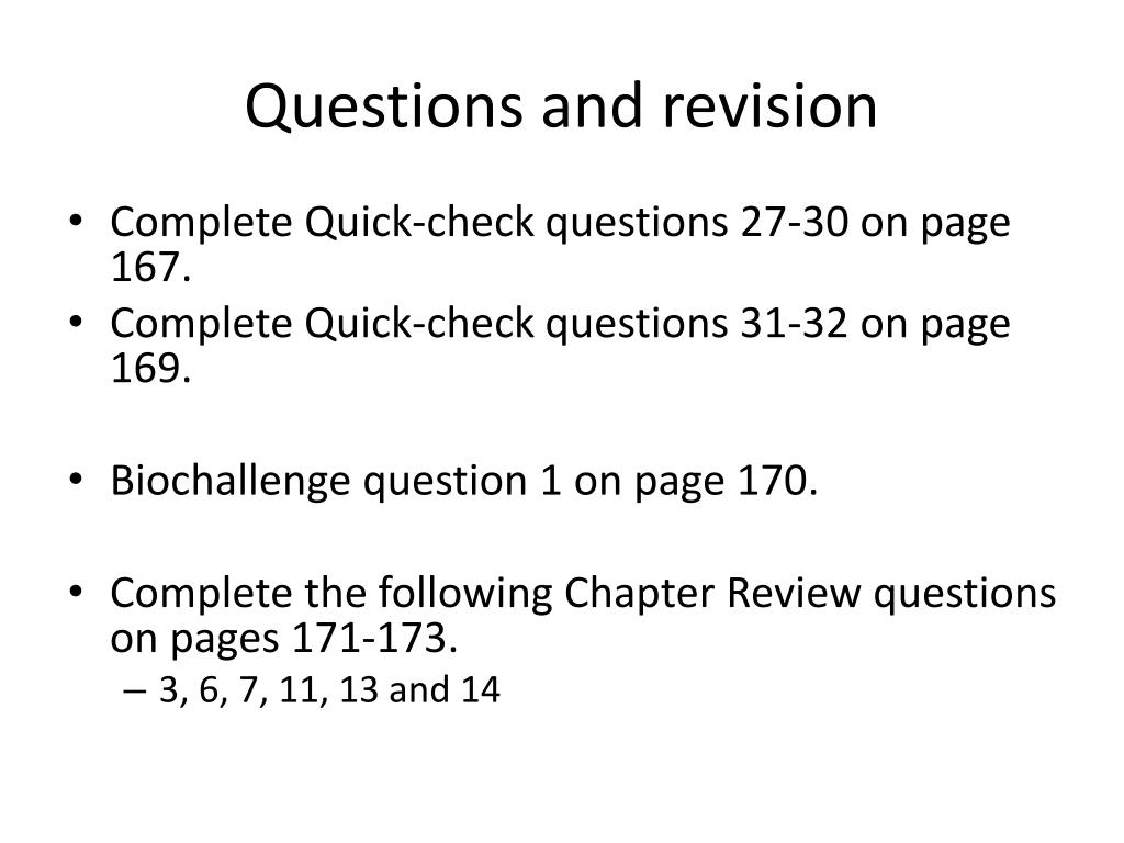 Questions and revision • Complete Quick-check questions 27-30 on page 167. • Complete Quick-check questions 31-32 on page 169. • Biochallenge question 1 on page 170. • Complete the following Chapter Review questions on pages 171-173. • 3, 6, 7, 11, 13 and 14