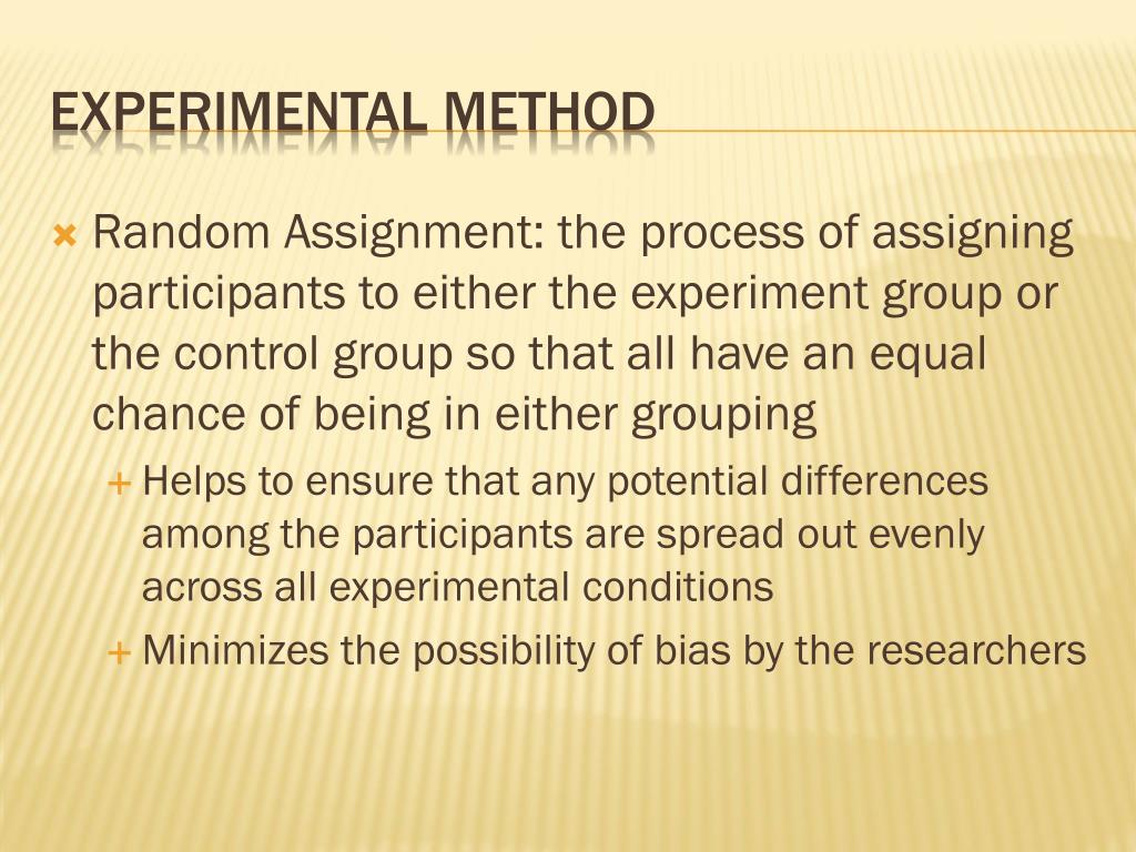 Random Assignment: the process of assigning participants to either the experiment group or the control group so that all have an equal chance of being in either grouping • Helps to ensure that any potential differences among the participants are spread out evenly across all experimental conditions • Minimizes the possibility of bias by the researchers Experimental Method