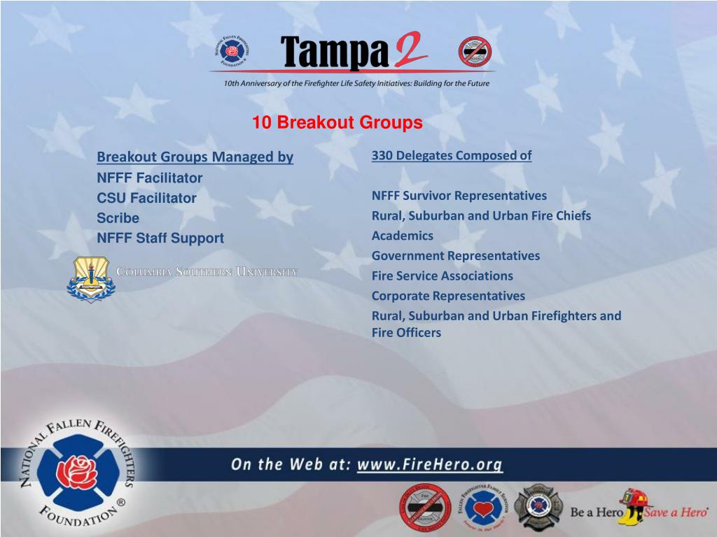 10 Breakout Groups 330 Delegates Composed of NFFF Survivor Representatives Rural, Suburban and Urban Fire Chiefs Academics Government Representatives Fire Service Associations Corporate Representatives Rural, Suburban and Urban Firefighters and Fire Officers Breakout Groups Managed by NFFF Facilitator CSU Facilitator Scribe NFFF Staff Support