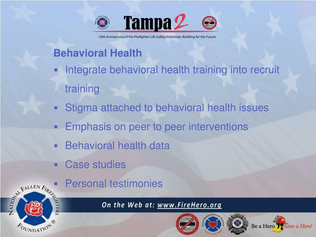 Behavioral Health • Integrate behavioral health training into recruit training • Stigma attached to behavioral health issues • Emphasis on peer to peer interventions • Behavioral health data • Case studies • Personal testimonies
