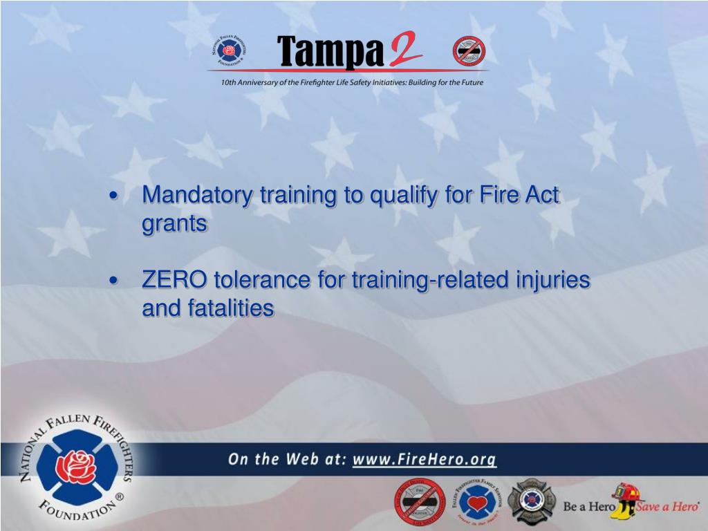 Mandatory training to qualify for Fire Act grants • ZERO tolerance for training-related injuries and fatalities