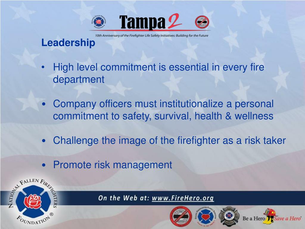 Leadership • High level commitment is essential in every fire department • Company officers must institutionalize a personal commitment to safety, survival, health & wellness • Challenge the image of the firefighter as a risk taker • Promote risk management