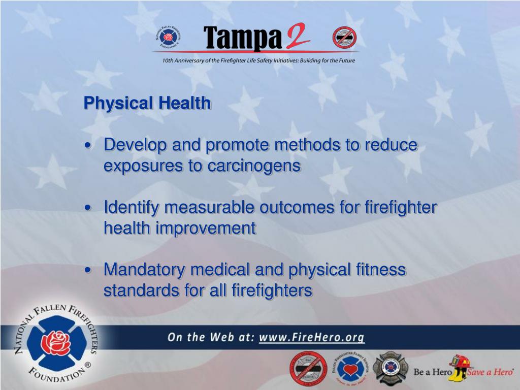 Physical Health • Develop and promote methods to reduce exposures to carcinogens • Identify measurable outcomes for firefighter health improvement • Mandatory medical and physical fitness standards for all firefighters