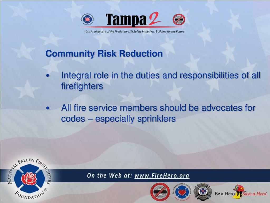 Community Risk Reduction • Integral role in the duties and responsibilities of all firefighters • All fire service members should be advocates for codes – especially sprinklers