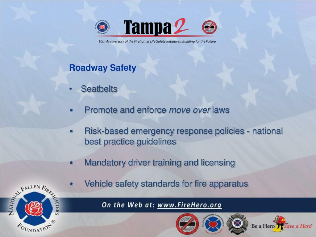 Roadway Safety • Seatbelts • Promote and enforce move over laws • Risk-based emergency response policies - national best practice guidelines • Mandatory driver training and licensing • Vehicle safety standards for fire apparatus