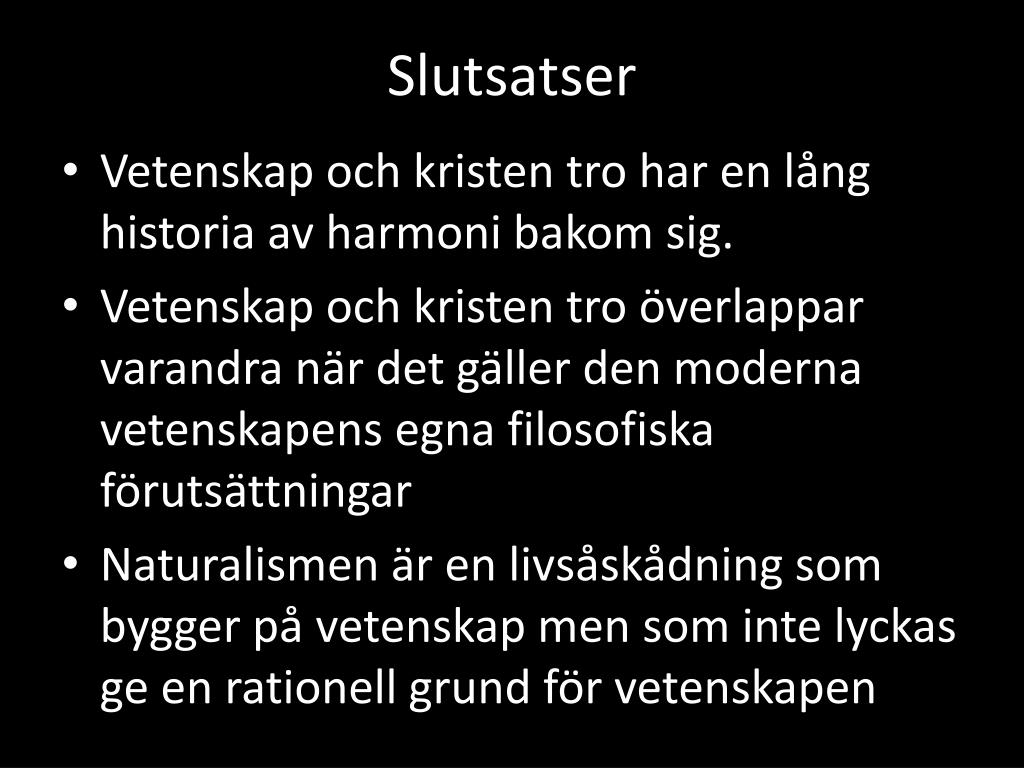 Slutsatser • Vetenskap och kristen tro har en lång historia av harmoni bakom sig. • Vetenskap och kristen tro överlappar varandra när det gäller den moderna vetenskapens egna filosofiska förutsättningar • Naturalismen är en livsåskådning som bygger på vetenskap men som inte lyckas ge en rationell grund för vetenskapen