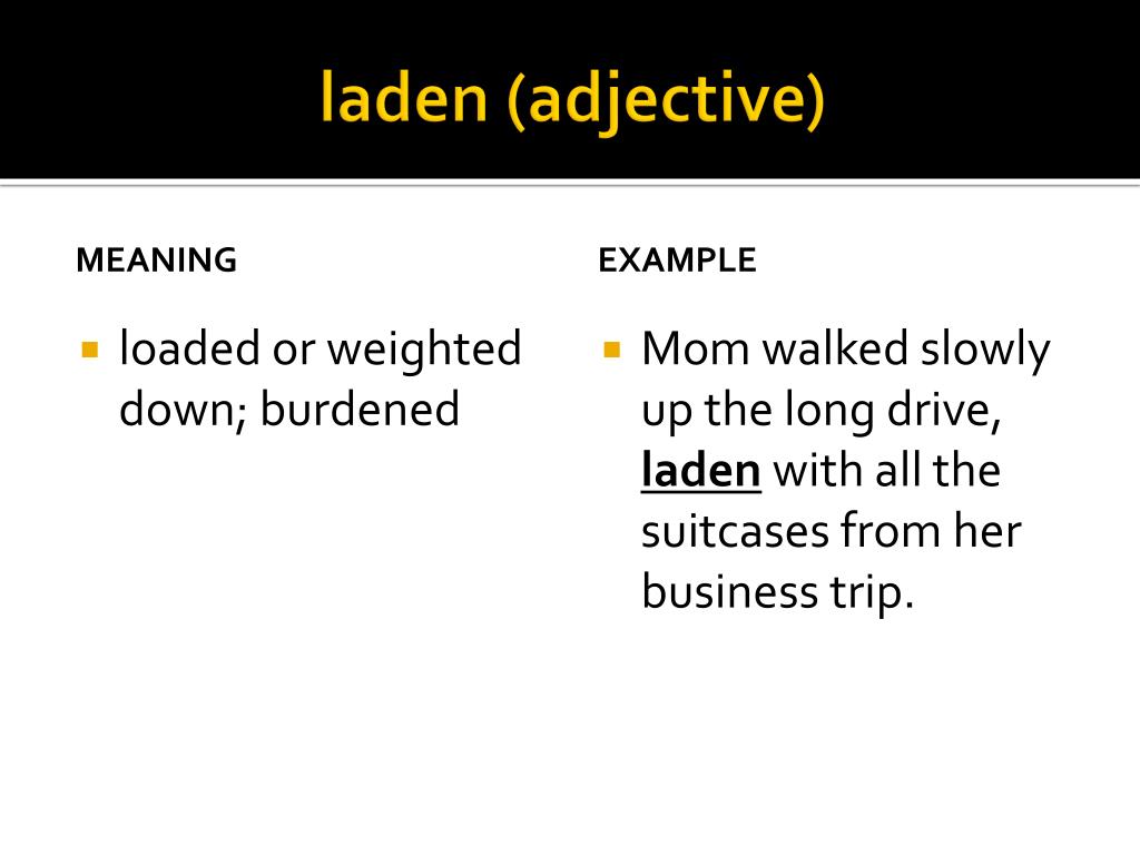 laden (adjective) MEANING EXAMPLE Mom walked slowly up the long drive, laden with all the suitcases from her business trip. • loaded or weighted down; burdened