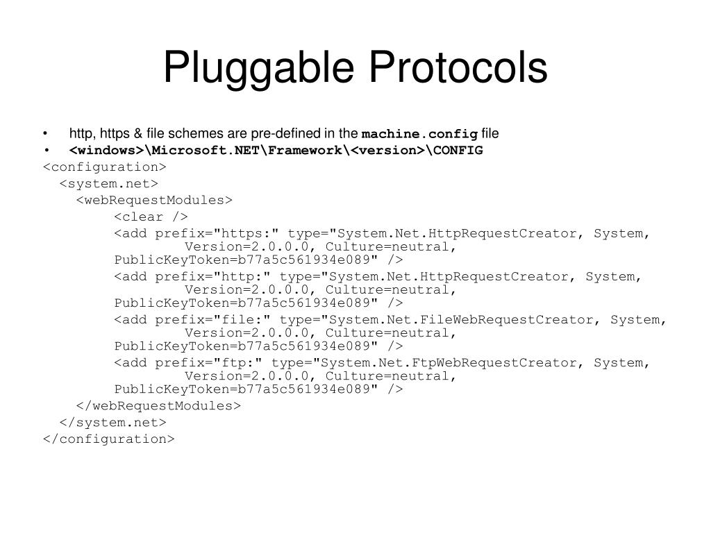 Pluggable Protocols • http, https & file schemes are pre-defined in the machine.config file • <windows>\Microsoft.NET\Framework\<version>\CONFIG <configuration> <system.net> <webRequestModules> <clear /> <add prefix="https:" type="System.Net.HttpRequestCreator, System, Version=2.0.0.0, Culture=neutral, PublicKeyToken=b77a5c561934e089" /> <add prefix="http:" type="System.Net.HttpRequestCreator, System, Version=2.0.0.0, Culture=neutral, PublicKeyToken=b77a5c561934e089" /> <add prefix="file:" type="System.Net.FileWebRequestCreator, System, Version=2.0.0.0, Culture=neutral, PublicKeyToken=b77a5c561934e089" /> <add prefix="ftp:" type="System.Net.FtpWebRequestCreator, System, Version=2.0.0.0, Culture=neutral, PublicKeyToken=b77a5c561934e089" /> </webRequestModules> </system.net> </configuration>