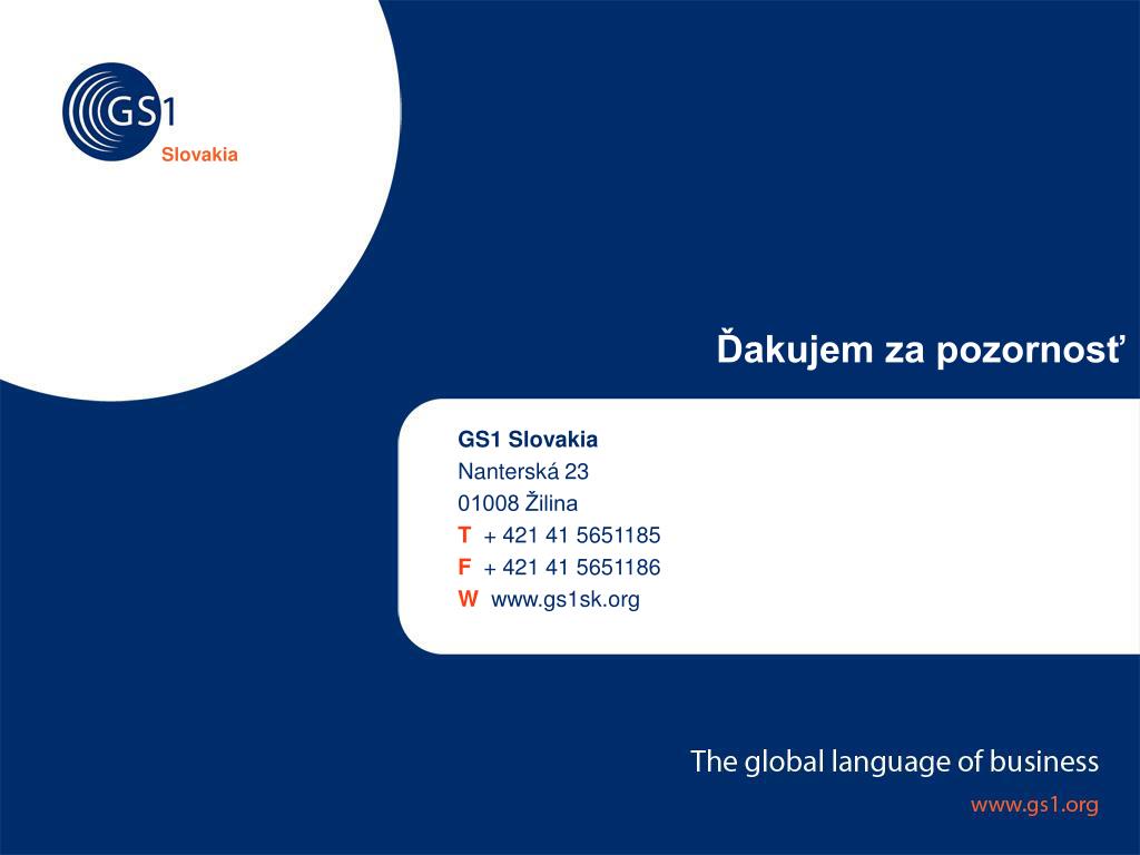 Slovakia Ďakujem za pozornosť GS1 Slovakia Nanterská 23 01008 Žilina T+ 421 41 5651185 F+ 421 41 5651186 W www.gs1sk.org