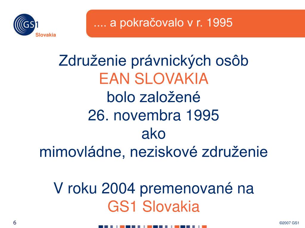 .... a pokračovalo v r. 1995 Združenie právnických osôb EAN SLOVAKIA bolo založené 26. novembra 1995 ako mimovládne, neziskové združenie V roku 2004 premenované na GS1 Slovakia
