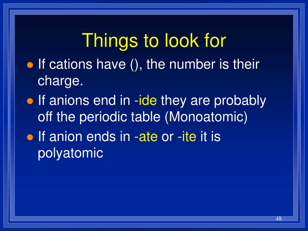 Things to look for • If cations have (), the number is their charge. • If anions end in -ide they are probably off the periodic table (Monoatomic) • If anion ends in -ate or -ite it is polyatomic