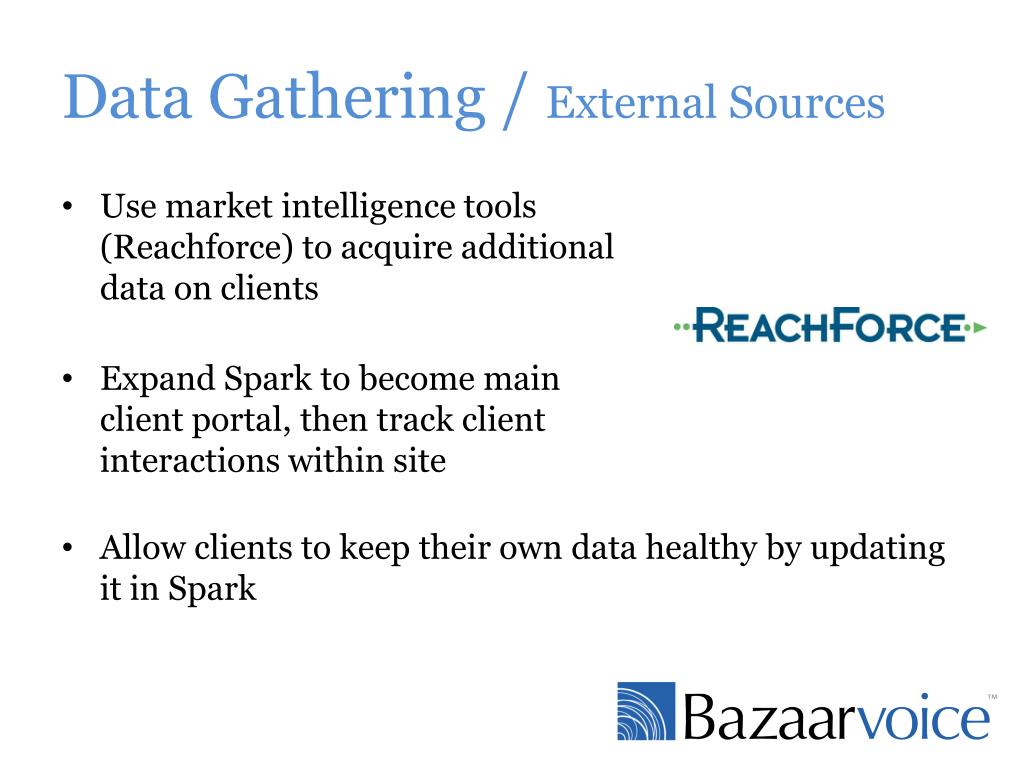 Data Gathering / External Sources • Use market intelligence tools (Reachforce) to acquire additional data on clients • Expand Spark to become main client portal, then track client interactions within site • Allow clients to keep their own data healthy by updating it in Spark
