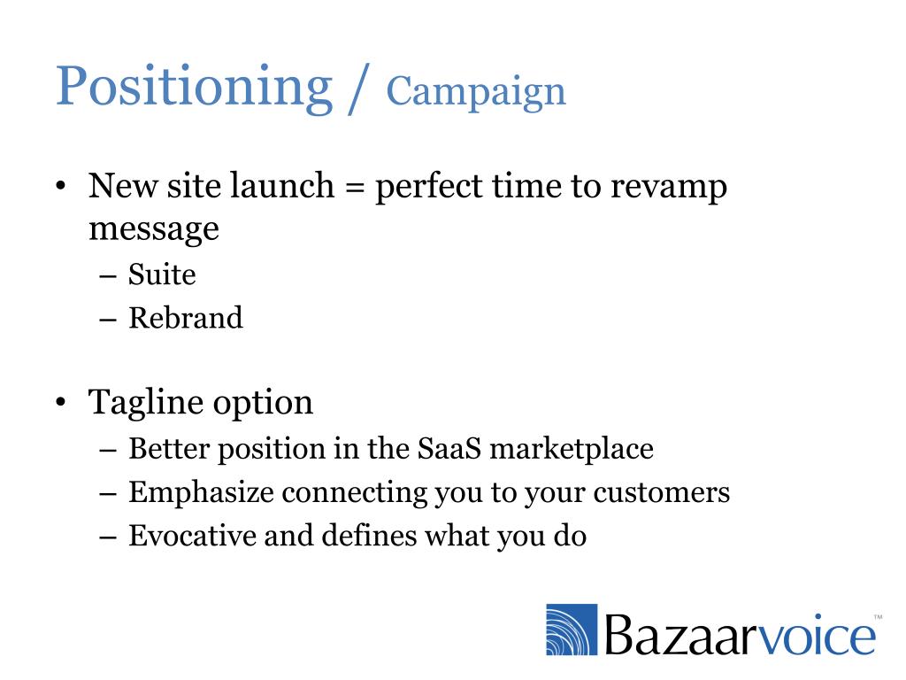 Positioning / Campaign • New site launch = perfect time to revamp message • Suite • Rebrand • Tagline option • Better position in the SaaS marketplace • Emphasize connecting you to your customers • Evocative and defines what you do