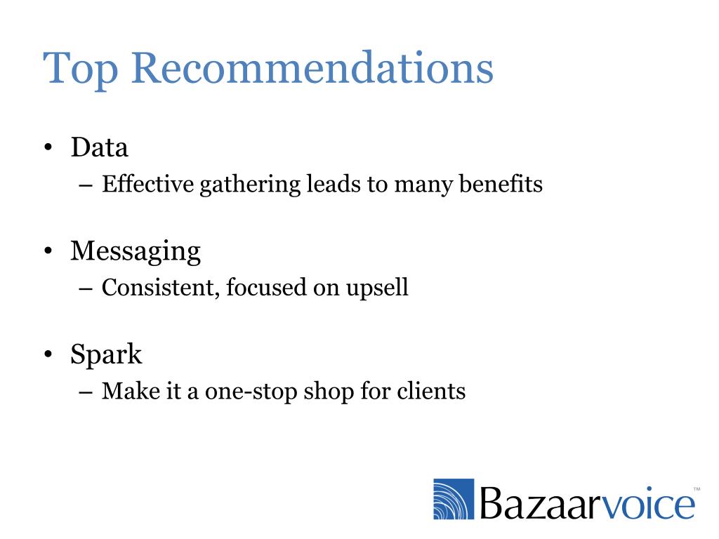 Top Recommendations • Data • Effective gathering leads to many benefits • Messaging • Consistent, focused on upsell • Spark • Make it a one-stop shop for clients