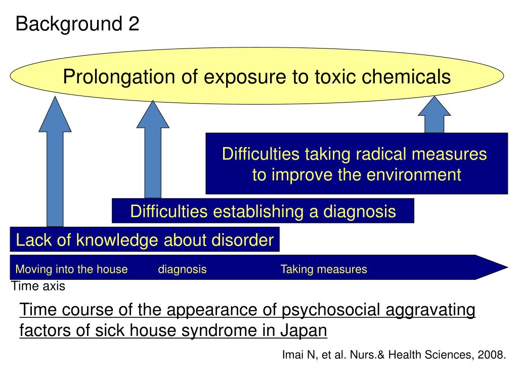 Background 2 Prolongation of exposure to toxic chemicals Difficulties taking radical measures to improve the environment Difficulties establishing a diagnosis Lack of knowledge about disorder Moving into the house diagnosis Taking measures Time axis Time course of the appearance of psychosocial aggravating factors of sick house syndrome in Japan Imai N, et al. Nurs.& Health Sciences, 2008.