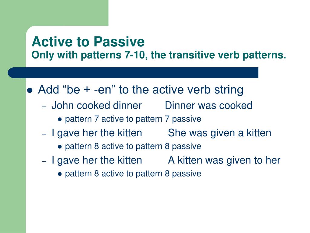 Active to PassiveOnly with patterns 7-10, the transitive verb patterns. • Add “be + -en” to the active verb string • John cooked dinner Dinner was cooked • pattern 7 active to pattern 7 passive • I gave her the kitten She was given a kitten • pattern 8 active to pattern 8 passive • I gave her the kitten A kitten was given to her • pattern 8 active to pattern 8 passive