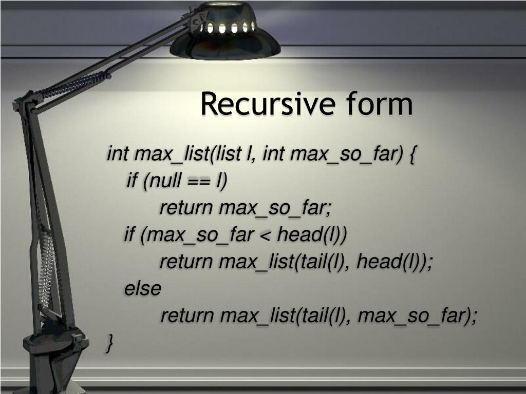 Recursive form int max_list(list l, int max_so_far) { if (null == l) return max_so_far; if (max_so_far < head(l)) return max_list(tail(l), head(l)); else return max_list(tail(l), max_so_far); }