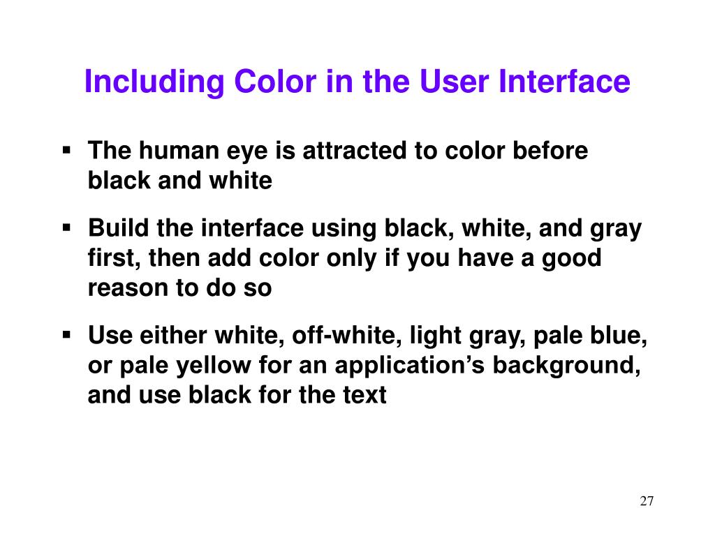 Including Color in the User Interface • The human eye is attracted to color before black and white • Build the interface using black, white, and gray first, then add color only if you have a good reason to do so • Use either white, off-white, light gray, pale blue, or pale yellow for an application’s background, and use black for the text
