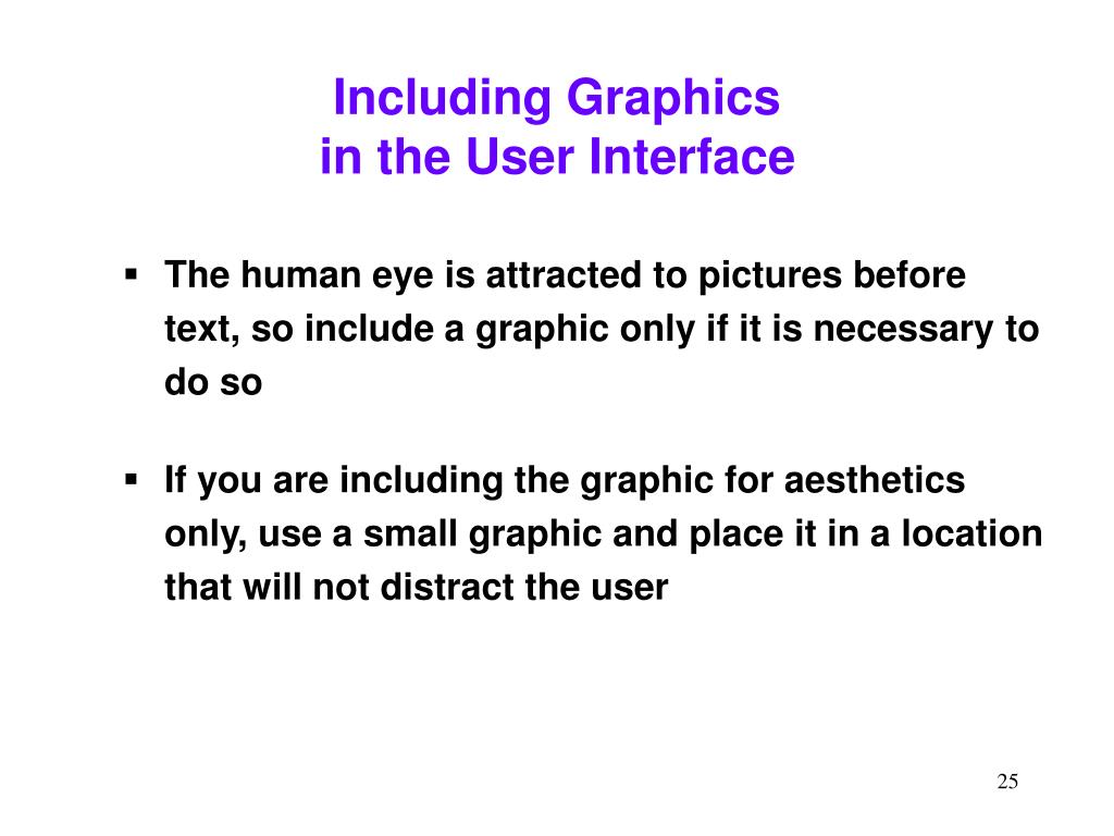 Including Graphics in the User Interface • The human eye is attracted to pictures before text, so include a graphic only if it is necessary to do so • If you are including the graphic for aesthetics only, use a small graphic and place it in a location that will not distract the user