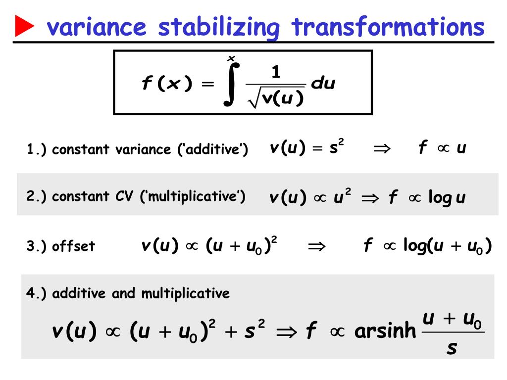 1.) constant variance (‘additive’) 2.) constant CV (‘multiplicative’) 3.) offset 4.) additive and multiplicative variance stabilizing transformations