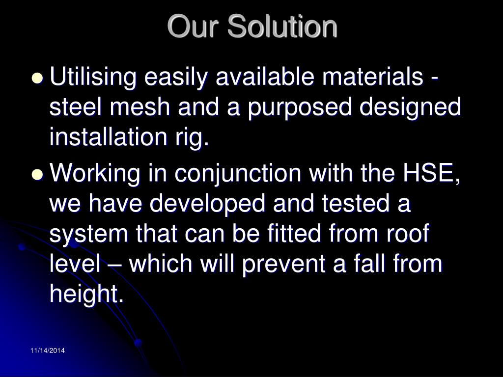 Our Solution • Utilising easily available materials - steel mesh and a purposed designed installation rig. • Working in conjunction with the HSE, we have developed and tested a system that can be fitted from roof level – which will prevent a fall from height.