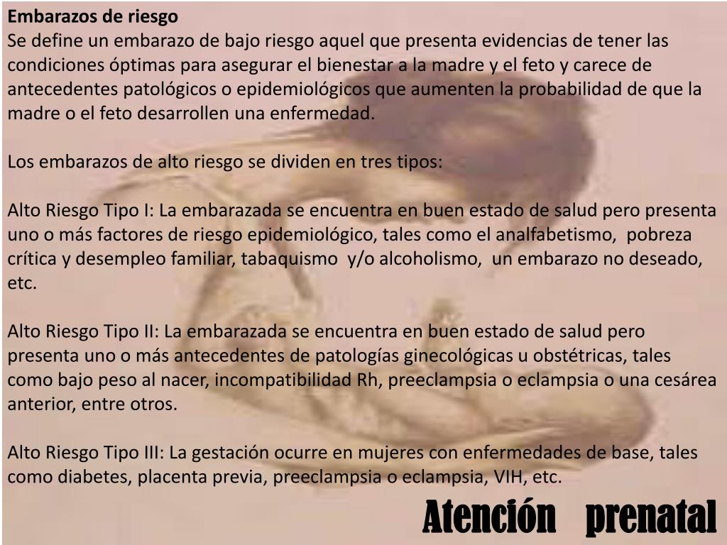 Embarazos de riesgo Se define un embarazo de bajo riesgo aquel que presenta evidencias de tener las condiciones óptimas para asegurar el bienestar a la madre y el feto y carece de antecedentes patológicos o epidemiológicos que aumenten la probabilidad de que la madre o el feto desarrollen una enfermedad. Los embarazos de alto riesgo se dividen en tres tipos: Alto Riesgo Tipo I: La embarazada se encuentra en buen estado de salud pero presenta uno o más factores de riesgo epidemiológico, tales como el analfabetismo, pobreza crítica y desempleo familiar, tabaquismo y/o alcoholismo, un embarazo no deseado, etc. Alto Riesgo Tipo II: La embarazada se encuentra en buen estado de salud pero presenta uno o más antecedentes de patologías ginecológicas u obstétricas, tales como bajo peso al nacer, incompatibilidad Rh, preeclampsiao eclampsiao una cesárea anterior, entre otros. Alto Riesgo Tipo III: La gestación ocurre en mujeres con enfermedades de base, tales como diabetes, placenta previa, preeclampsia o eclampsia, VIH, etc. Atención prenatal