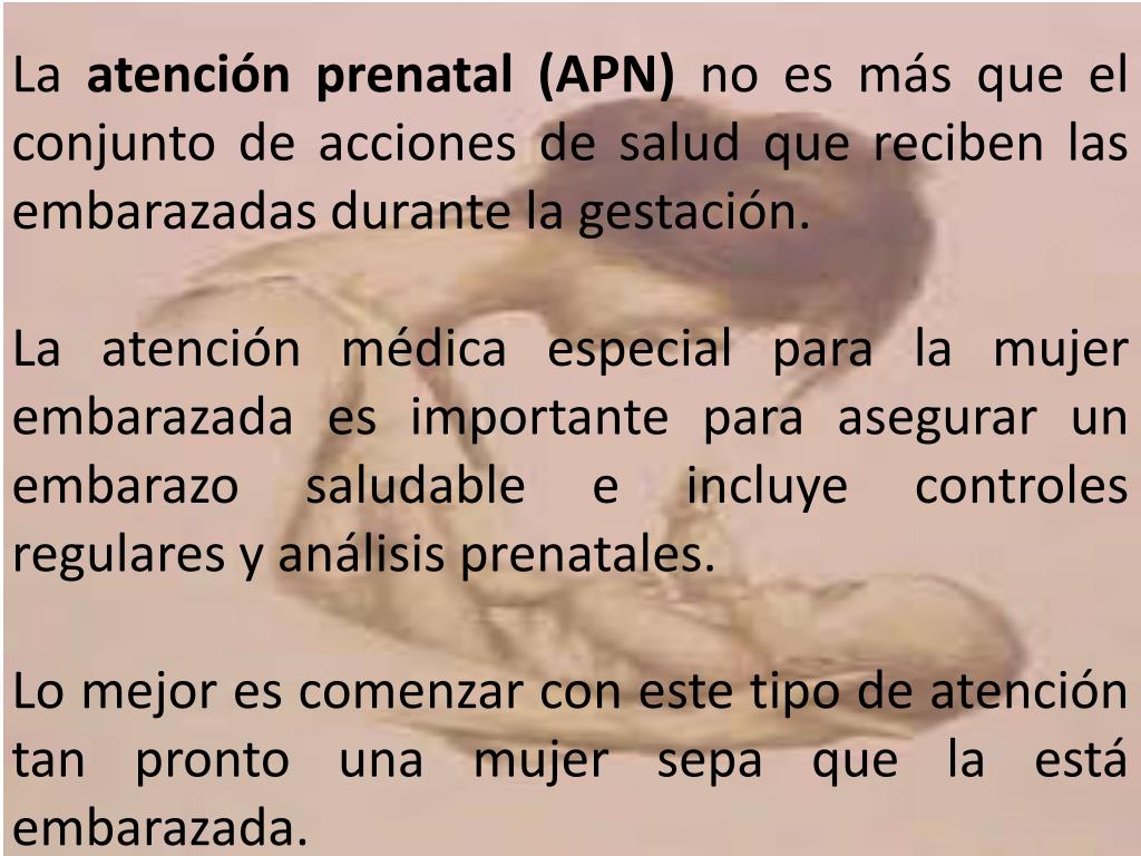 La atención prenatal (APN) no es más que el conjunto de acciones de salud que reciben las embarazadas durante la gestación. La atención médica especial para la mujer embarazada es importante para asegurar un embarazo saludable e incluye controles regulares y análisis prenatales. Lo mejor es comenzar con este tipo de atención tan pronto una mujer sepa que la está embarazada.