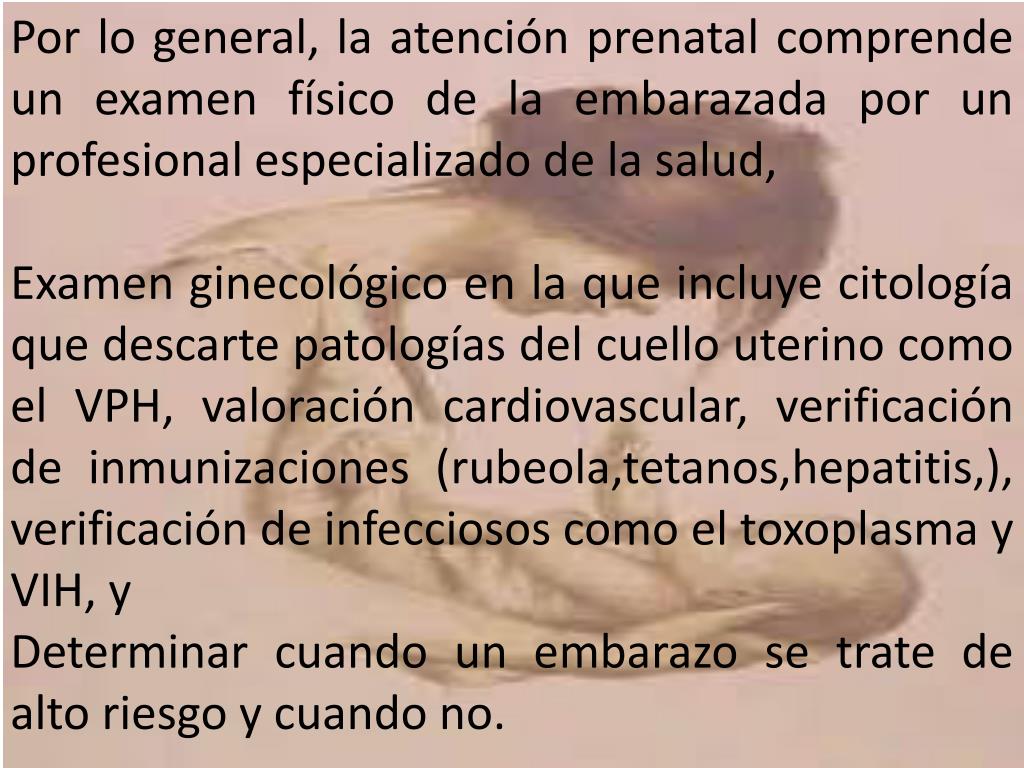 Por lo general, la atención prenatal comprende un examen físico de la embarazada por un profesional especializado de la salud, Examen ginecológico en la que incluye citología que descarte patologías del cuello uterino como el VPH, valoración cardiovascular, verificación de inmunizaciones (rubeola,tetanos,hepatitis,), verificación de infecciosos como el toxoplasma y VIH, y Determinar cuando un embarazo se trate de alto riesgo y cuando no.