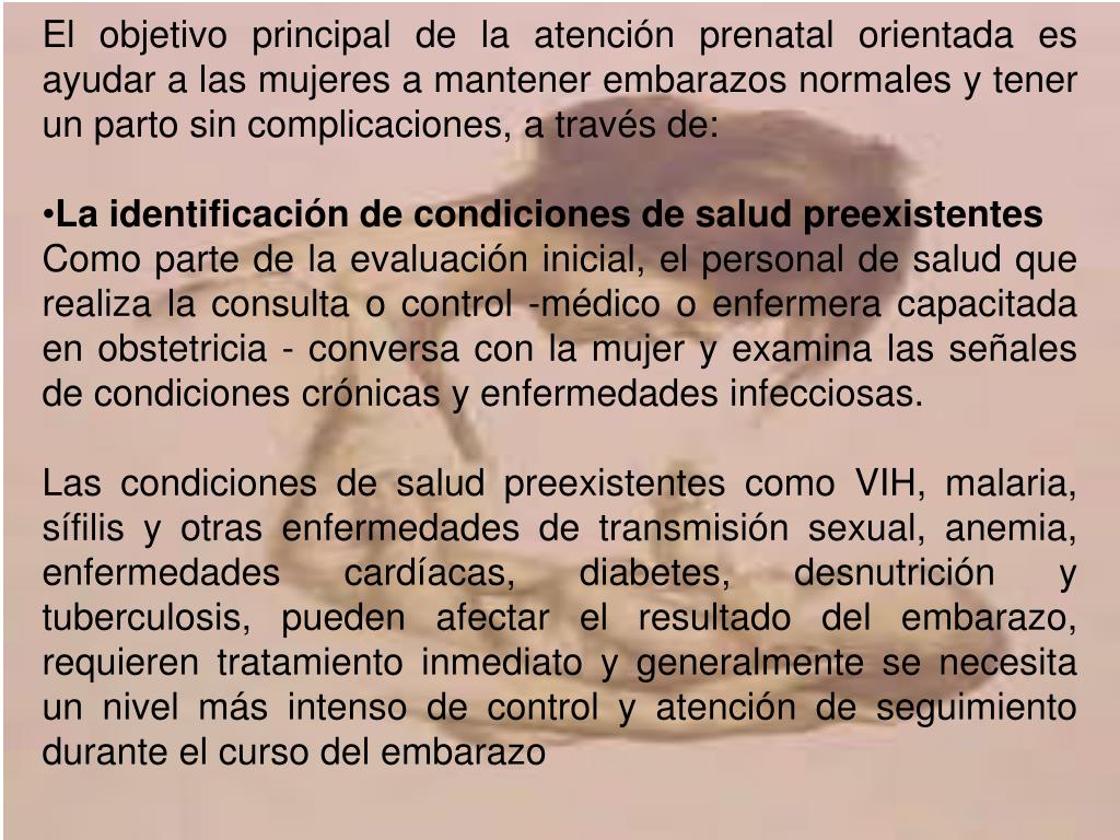 El objetivo principal de la atención prenatal orientada es ayudar a las mujeres a mantener embarazos normales y tener un parto sin complicaciones, a través de: • La identificación de condiciones de salud preexistentes • Como parte de la evaluación inicial, el personal de salud que realiza la consulta o control -médico o enfermera capacitada en obstetricia - conversa con la mujer y examina las señales de condiciones crónicas y enfermedades infecciosas. • Las condiciones de salud preexistentes como VIH, malaria, sífilis y otras enfermedades de transmisión sexual, anemia, enfermedades cardíacas, diabetes, desnutrición y tuberculosis, pueden afectar el resultado del embarazo, requieren tratamiento inmediato y generalmente se necesita un nivel más intenso de control y atención de seguimiento durante el curso del embarazo