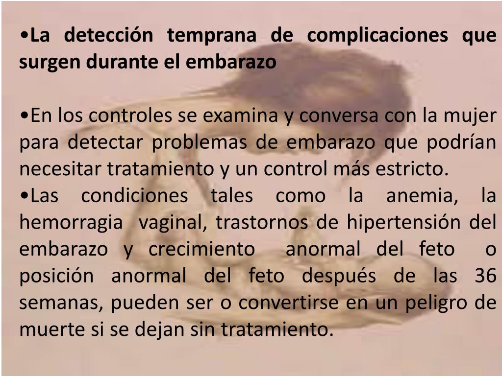 La detección temprana de complicaciones que surgen durante el embarazo • En los controles se examina y conversa con la mujer para detectar problemas de embarazo que podrían necesitar tratamiento y un control más estricto. • Las condiciones tales como la anemia, la hemorragiavaginal, trastornos de hipertensióndel embarazo y crecimientoanormal del feto o posición anormal del feto después de las 36 semanas, pueden ser o convertirse en un peligro de muerte si se dejan sin tratamiento.
