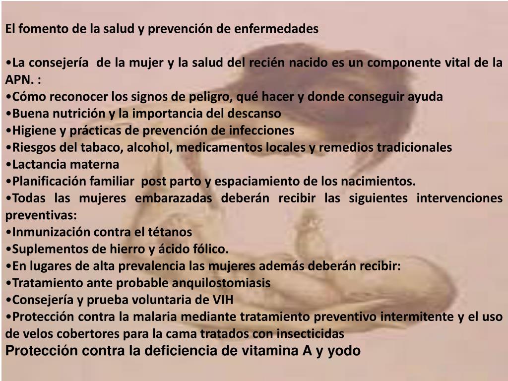 El fomento de la salud y prevención de enfermedades • La consejería de la mujer y la salud del recién nacido es un componente vital de la APN. : • Cómo reconocer los signos de peligro, qué hacer y donde conseguir ayuda • Buena nutrición y la importancia del descanso • Higieney prácticas de prevención de infecciones • Riesgos del tabaco, alcohol, medicamentos locales y remedios tradicionales • Lactancia materna • Planificación familiar post parto y espaciamiento de los nacimientos. • Todas las mujeres embarazadas deberán recibir las siguientes intervenciones preventivas: • Inmunización contra el tétanos • Suplementos de hierro y ácido fólico. • En lugares de alta prevalencia las mujeres además deberán recibir: • Tratamiento ante probable anquilostomiasis • Consejería y prueba voluntaria de VIH • Protección contra la malaria mediante tratamiento preventivo intermitente y el uso de velos cobertores para la cama tratados con insecticidas Protección contra la deficiencia de vitamina A y yodo