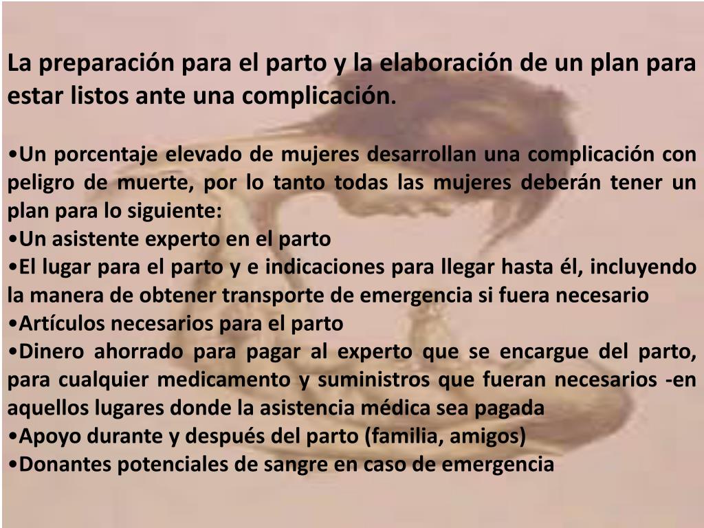 La preparación para el partoy la elaboración de un plan para estar listos ante una complicación. • Un porcentaje elevado de mujeres desarrollan una complicación con peligro de muerte, por lo tanto todas las mujeres deberán tener un plan para lo siguiente: • Un asistente experto en el parto • El lugar para el parto y e indicaciones para llegar hasta él, incluyendo la manera de obtener transporte de emergencia si fuera necesario • Artículos necesarios para el parto • Dinero ahorrado para pagar al experto que se encargue del parto, para cualquier medicamento y suministros que fueran necesarios -en aquellos lugares donde la asistencia médica sea pagada • Apoyo durante y después del parto (familia, amigos) • Donantes potenciales de sangre en caso de emergencia