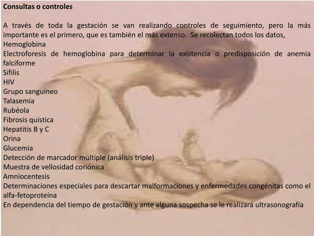 Consultas o controles A través de toda la gestación se van realizando controles de seguimiento, pero la más importante es el primero, que es también el más extenso. Se recolectan todos los datos, Hemoglobina Electroforesis de hemoglobina para determinar la existencia o predisposición de anemia falciforme Sífilis HIV Grupo sanguíneo Talasemia Rubéola Fibrosis quística Hepatitis By C Orina Glucemia Detección de marcador múltiple (análisis triple) Muestra de vellosidad coriónica Amniocentesis Determinaciones especiales para descartar malformaciones y enfermedades congénitas como el alfa-fetoproteína En dependencia del tiempo de gestación y ante alguna sospecha se le realizará ultrasonografía