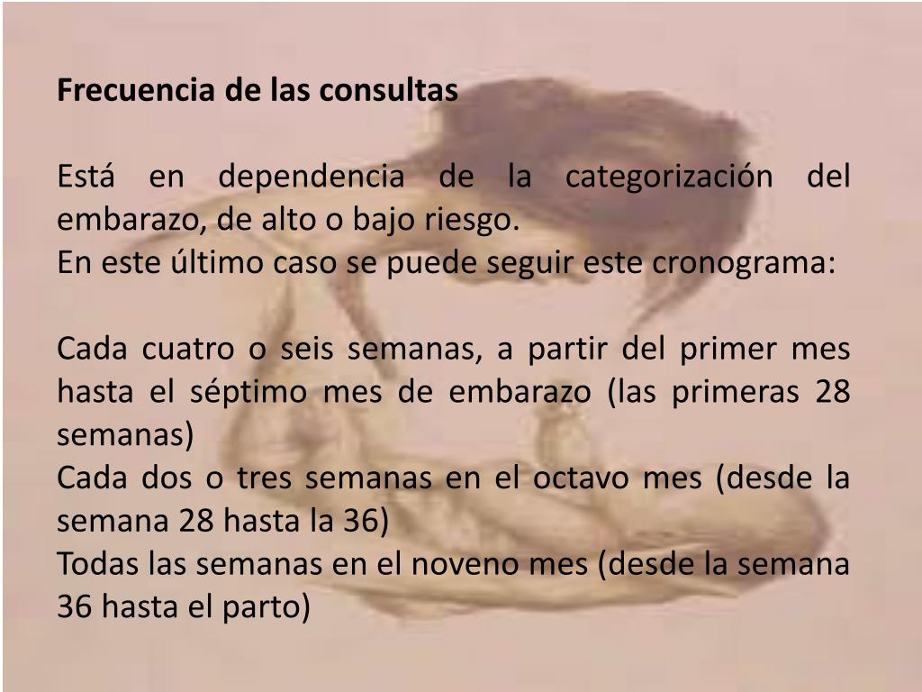 Frecuencia de las consultas Está en dependencia de la categorización del embarazo, de alto o bajo riesgo. En este último caso se puede seguir este cronograma: Cada cuatro o seis semanas, a partir del primer mes hasta el séptimo mes de embarazo (las primeras 28 semanas) Cada dos o tres semanas en el octavo mes (desde la semana 28 hasta la 36) Todas las semanas en el noveno mes (desde la semana 36 hasta el parto)