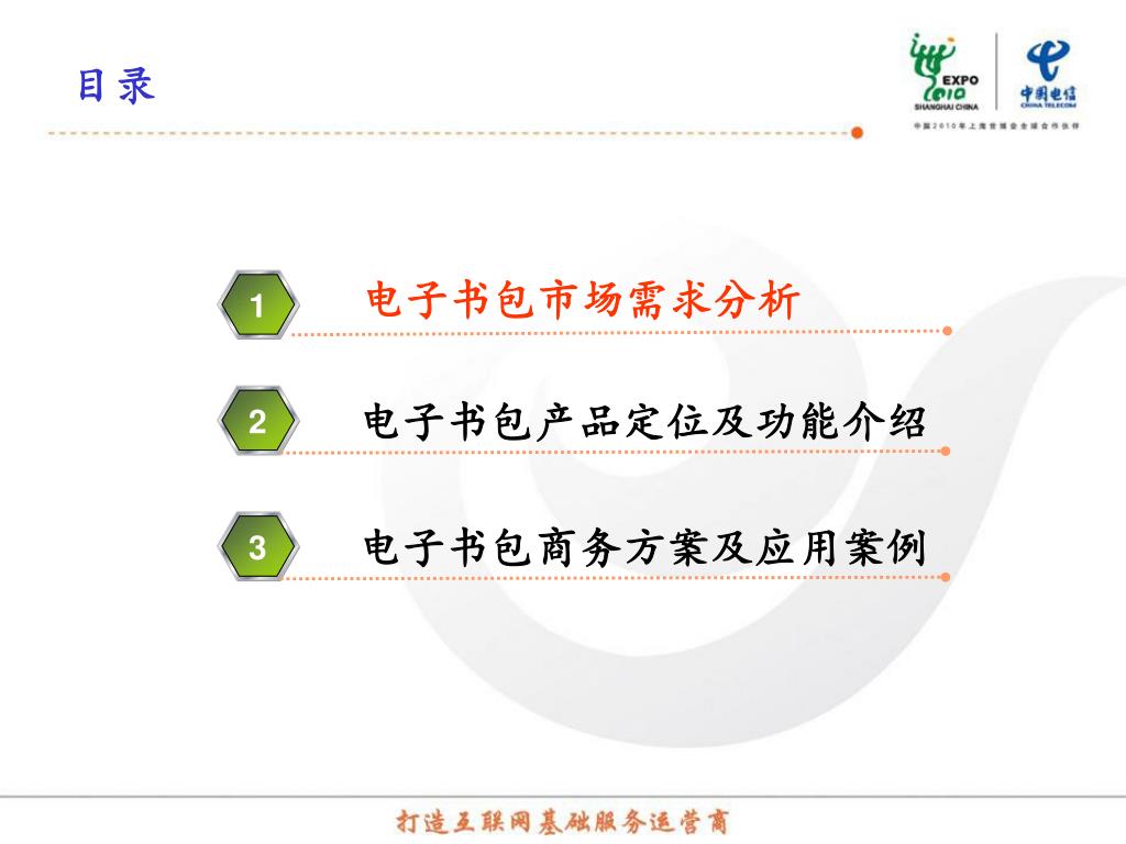 上海电信互联网部教育中心 2011 年 1 月. 中国电信电子书包解决方案. 目录. 2. 3. 电子书包市场需求分析. 1. 电子书包产品定位及功能介绍. 电子书包商务方案及应用案例. 宏观环境利好,电子书包应运而生. 教育部提出,要促进教育内容、手段和方法现代化 上海教委已规划探索使用电子书包,推动学生运用信息技术丰富课外学习 政府相关部门出台多个政策,要求切实减轻中小学生过重的课业负担,把“减负”贯穿到教学和校内校外各个方面 减少课时总量,严格执行课时计划;减轻学生书包重量 目前中小学生由于升学压力大,减负进展缓慢. 符合政策趋势.