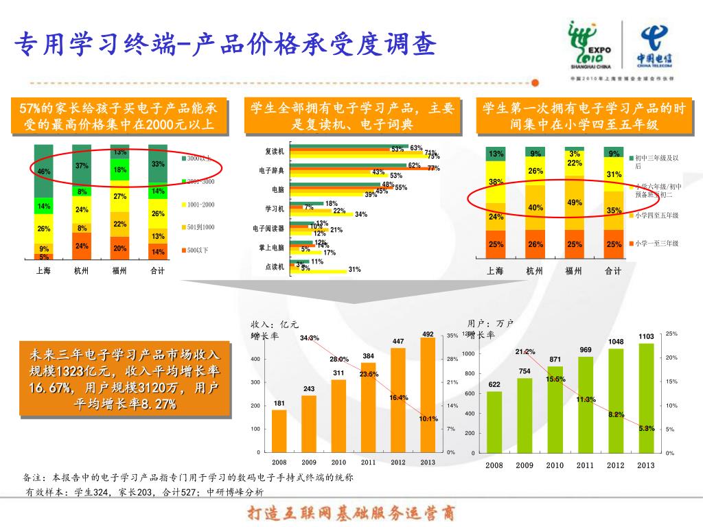 用户:万户 增长率 收入:亿元 增长率 专用学习终端-产品价格承受度调查 学生全部拥有电子学习产品,主要是复读机、电子词典 57%的家长给孩子买电子产品能承受的最高价格集中在2000元以上 学生第一次拥有电子学习产品的时间集中在小学四至五年级 未来三年电子学习产品市场收入规模1323亿元,收入平均增长率16.67%,用户规模3120万,用户平均增长率8.27% 备注:本报告中的电子学习产品指专门用于学习的数码电子手持式终端的统称 有效样本:学生324,家长203,合计527;中研博峰分析
