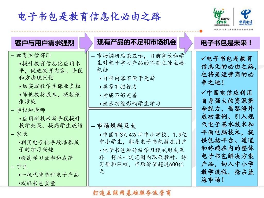 电子书包是教育信息化必由之路 现有产品的不足和市场机会 客户与用户需求强烈 电子书包是未来! • 教育主管部门 • 提升教育信息化应用水平,促进教育内容、手段和方法现代化 • 切实减轻学生课业负担 • 降低教材成本,减轻纸张污染 • 学校和老师 • 应用新技术新手段提升教学效果、提高学生成绩 • 家长 • 利用电子化手段培养孩子的学习兴趣 • 提高学习效率和成绩 • 学生 • 一机代替多种电子产品 • 减轻书包重量 • 市场调研结果显示,目前家长和学生对电子学习产品的不满之处主要包括 • 自带内容不便于更新 • 屏幕有损视力 • 功能不够完善 • 娱乐功能影响学生学习 • 电子书包是教育信息化的必由之路,也将是运营商的必争之地! • 中国电信应利用自身强大的资源整合能力,借鉴海外成功案例、引入现代电子墨水技术和平面电脑技术,提供包括平台、通道和终端在内的整体电子书包解决方案产品,切入中小学教学流程,抢占蓝海市场! • 市场规模巨大 • 中国有37.4万所中小学校,1.9亿中小学生,都是电子书包潜在用户 • 电子书包和传统学习模式形成互补,将在一定范围内取代教材、练习册和网校,市场价值超过600亿元